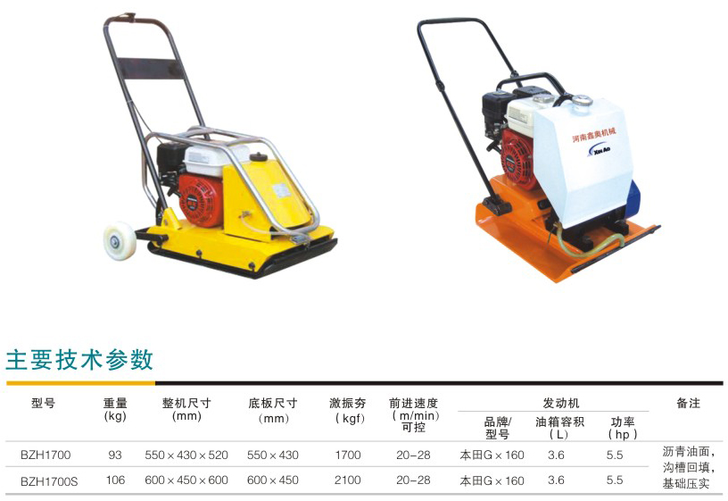 BZH系列平板振動夯是輕型夯實機械,廣泛應用于壓實粒狀材料及帶有粘性的混合材料如瀝青路面、砂石基礎、灰土基礎的夯實作業,體積小、機動性強、操作簡便,更適應于小規模修復,狹窄地帶及地形復雜地域壓實。